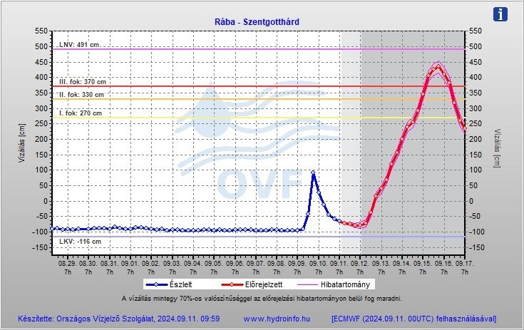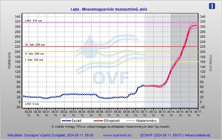 Az Országos Vízjelző Szolgálat előrejelzése szerint mind a Rábán, mind a Lajtán harmadfokú készültségi szintet meghaladó vízállás jöhet a jövő hét elejére. A Lajta vízszintje Mosonmagyaróvárnál a jelenlegi előrejelzések szerint az eddigi legmagasabb vízállást is megközelítheti.