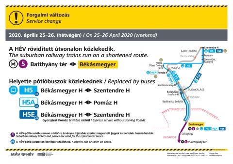 Karbantartás miatt a hétvégén, április 25-én és 26-án a H5-ös HÉV csak a Batthyány tér és Békásmegyer között jár. A kimaradó szakaszon a H5-ös, a H5A és a H5E jelzésű pótlóbuszokkal lehet utazni.