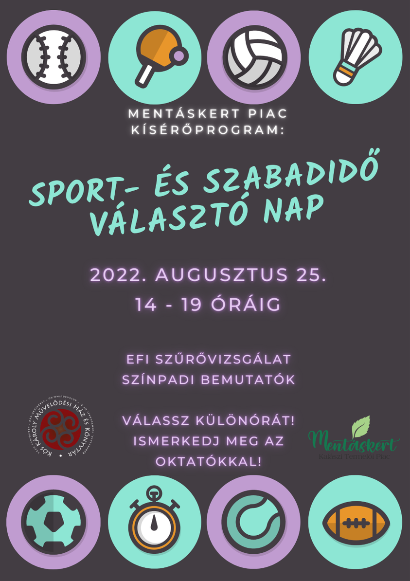 Idén másodszorra rendezik meg a Mentáskert szervezői a sport- és különóraválasztó délutánt augusztus 25-én 16 órától, ahol megismerhetik a családok, milyen programot tudnak Budakalászon találni gyermekeiknek, hogy tartalmasan töltsék el délutánjaikat. A program folyamán számos mozgásos, és kreatív programot ismerhetnek meg és választhatnak ki az érdeklődők. A szervezők még várják azoknak a sport és egyéb foglalkozásvezetők jelentkezését, akik szeretnék bemutatni a szolgáltatásukat a városnak. Jelentkezni a következő e-mail címen lehet: utto.vanda@koskarolymh.hu