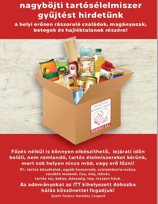 Tartósélelmiszer gyűjtést szervez a Budakalászi Szent Ferenc Karitász csoport. Ma (kedd) délután 17-18 óra között és holnap délelőtt 9-10 között. Három budakalászi helyszínen várják a tartósélelmiszereket, főként konzervet, lisztet, cukrot, olajat, lekvárt, kekszet, teát, stb. a helyi egyre nagyobb számú és egyre nehezebb helyzetbe kerülő családoknak, időseknek, betegeknek!