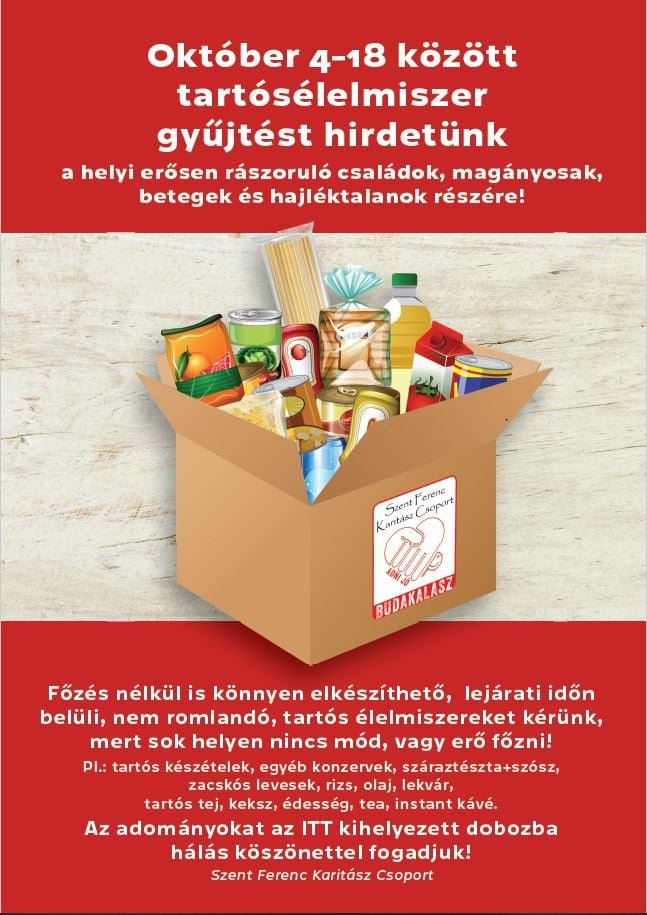 Ezért ismét tartósélelmiszer gyűjtést szerveznek Budakalász három pontján, a Faluházban és a két katolikus templomban az alábbiak szerint:
