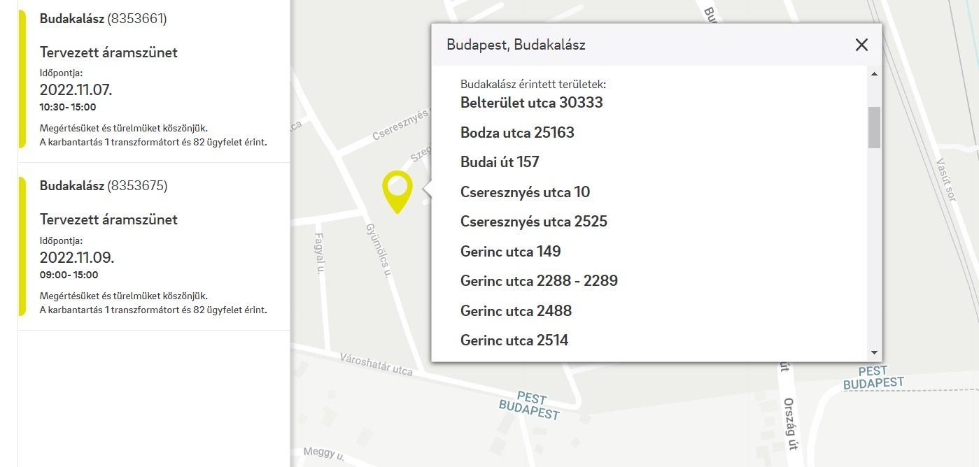 A címek és dátumok tételes felsorolását a Szolgáltató oldalán, a Tervezett áramszünetek fül alatt találják meg.