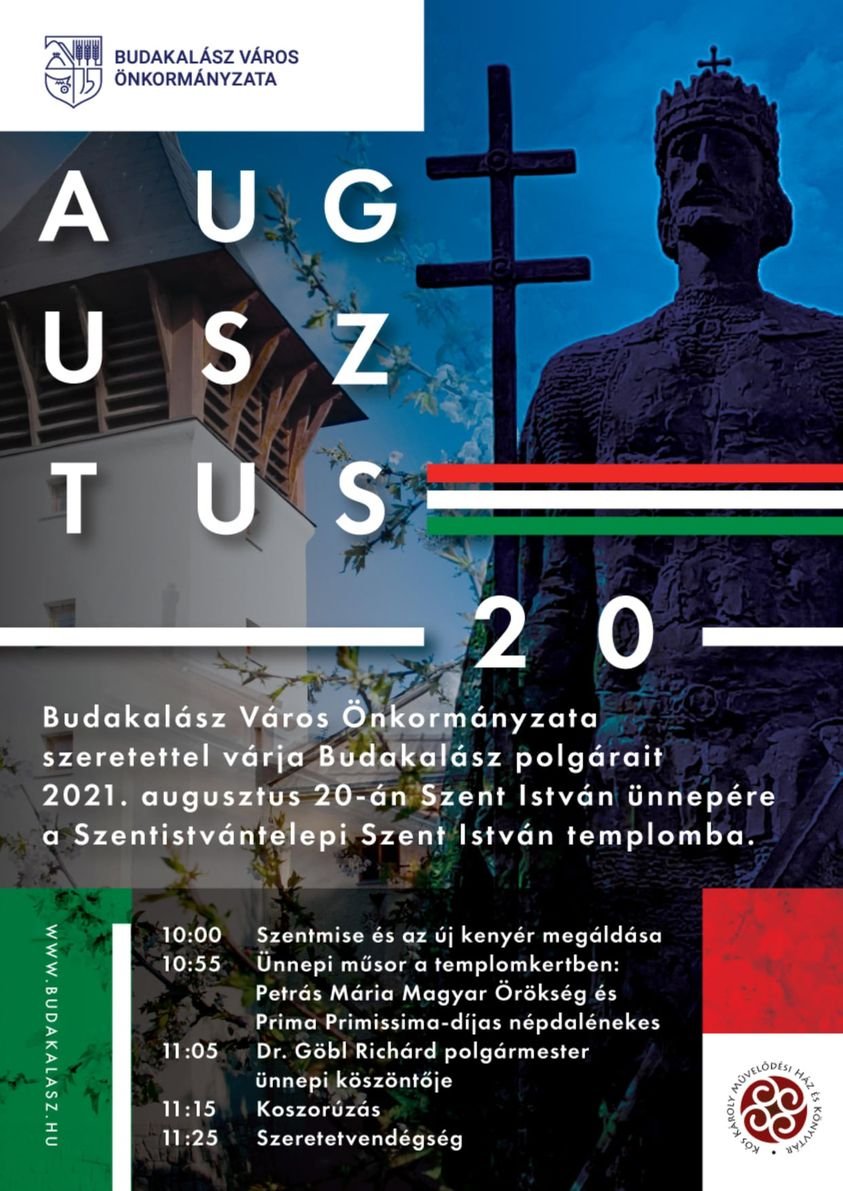 Budakalász Város Önkormányzata szeretettel várja Budakalász polgárait 2021. augusztus 20-án Szent István ünnepére a Szentistvántelepi Szent István templomba.