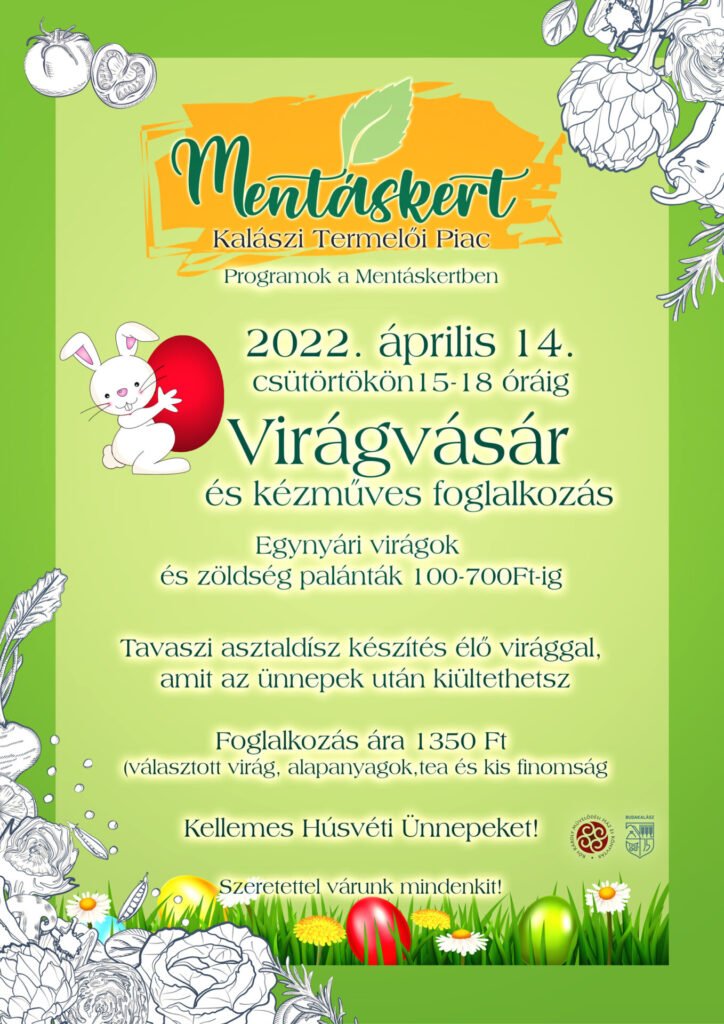 Budakalász Termelői Piacán ezúttal vidám tavaszi programmal és virágvásárral is készülnek a szervezők. 2022 április 14-én csütörtökön 15-18 óráig még van lehetőség bevásárolni minőségi alapanyagokat a húsvéti menüsorhoz. A piacon virág- és palántavásár is lesz, valamint kézműves foglalkozásra is várja a látogatóit a Mentáskert.