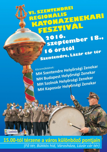 Immár hatodik alkalommal kerül megrendezésre Szentendrén a Regionális Katonazenekari Fesztivál. Az idén a szentendrei, a budapesti, a szolnoki és a kaposvári helyőrségi zenekar játszik a fesztiválon.