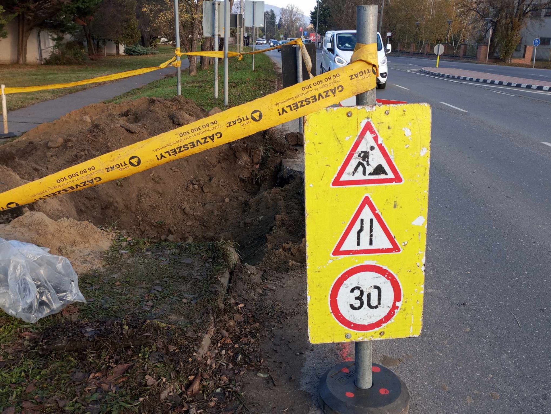 A munkálatok helyén a 11-es út érintett, mintegy 15 méteres útszakaszán Budapest felé a szélső sávban fél méteres útszűkület van, ezt táblák jelzik, 30 km/H sebességkorlátozás van érvényben. Az út melletti zöld sávban és a padka helyén ásott munkagödröt hajnali négy óra előtt a kivitelező befedte. A burkolat helyreállítását a Tigáz alvállalkozója a reggeli csúcsforgalom után folytatja. A munkálatok ideje alatt a szélső sávot várhatóan 2-3 órára lezárják.