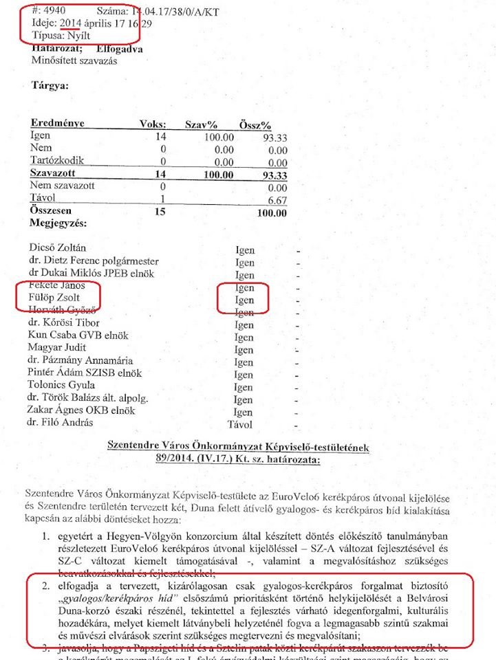 A határozatból az is kiderül, hogy a 2014. április 17-én ülésező testületben 3 olyan képviselő volt, akik jelenleg is a Képviselő-testület tagjai. Magyar Judit (MSZP), Zakar Ágnes (FIDESZ-KDNP) és Fülöp Zsolt (TESZ) is megszavazta a határozatot. A jegyzőkönyvből kiderül, hogy a 2014-es ülésről csak dr. Filó András (Jobbik) hiányzott, de 14 fővel így is határozatképes volt a testület. A grémium egyhangúlag megszavazata a Hegyen-Völgyön Konzorcium által készített tanulmányban részletezett, EuroVelo6 kerékpáros útvonal kijelölését, valamint elfogadta a kizárólagosan csak gyalogos-kerékpáros forgalmat biztosító „gyalogos/kerékpáros híd” elsőszámú, prioritásként történő helykijelölését a Belvárosi Duna-korzó északi részénél.