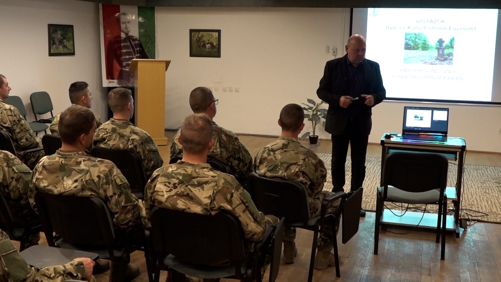 Hadisírgondozás a háború árnyékában – A Vigyázók Ukrajnában és Szerbiában. Ezzel a címmel adott előadást a Vigyázók Had- és Kultúrtörténeti Egyesület elnöke, Hangácsi István nyugállományú alezredes. Az előadó az egyesület tevékenységéről beszélt a jelenlévőknek. A hallgatóság nagy részét az Acélkocka program leendő altisztjei tették ki.