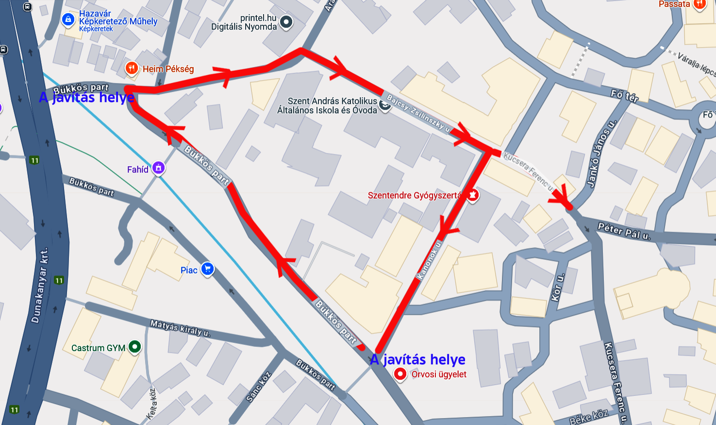 A javítási munkák a Bükkös part Bajcsy-Zsilinszky és Kanonok utca közötti szakaszán lesznek. A hibaelhárítás idejére érvényes ideiglenes forgalmi rend szerint a Bükkös partot egyirányúsítják a Dunakanyar krt. felé, és a Bajcsy Zsilinszky útról a Kucsera Ferenc utca felé haladhanak tovább az autósok az alábbi térképen jelzettek szerint.