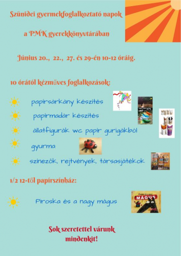 A szünidőben színes nyári kalandokkal várják a gyermekkönyvtár kis látogatóit a PMK-ban. Megelevenednek a mesehősök, akiket papírból, gyurmából is elkészíthetnek a kézműves foglalkozásokon. A vakáció ideje alatt a papírszínházzal is megismerkedhetnek, amikor a Piroska és a nagy mágus című mesét nézhetik meg a kézművesedés után.
