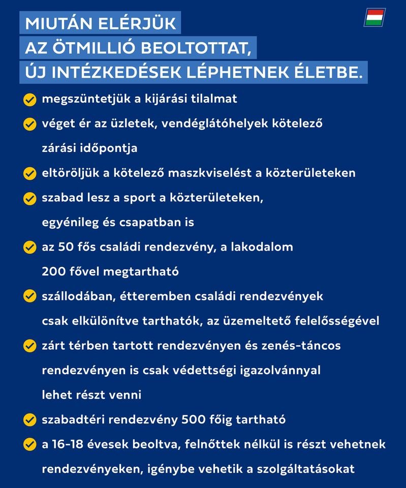 Ma reggel Orbán Viktor volt a Kossuth rádió vendége. A miniszterelnök bejelentette, hogy 5 millió beoltottnál megszűnik a kijárási tilalom. Az üzletek kötelező zárási időpontját is eltörli a kormány valamint nem lesz kötelező a közterületi maszkviselés. Szabadon lehet sportolni létszámkorlát nélkül közterületeken. A magán és a családi rendezvényeken az eddigi 10 helyett 50 fő lesz a létszámkorlát. Lagzikat is lehet tartani kétszáz főig, ha szállodában rendezik meg az üzemeltetőnek kötelessége elkülöníteni a külön rendezvényre érkezőket. A zárt téri rendezvényeket továbbra is védettségi igazolvánnyal lehet látogatni, a szabadtéri eseményeken viszont bárki részt vehet 500 főig. A zenés, táncos rendezvényeket csak védettségi igazolvánnyal látogatható. A 16-18 éves beoltottakra ugyanaz vonatkozik mint a nagykorúakra, tehát nem lesz már szükség kísérőre.
