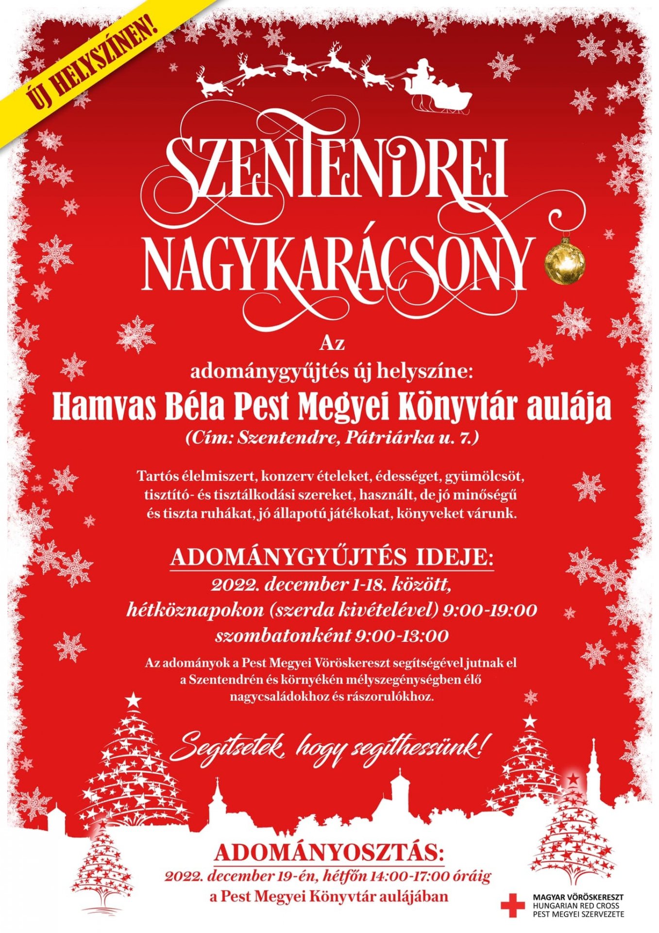 Új helyszínen, de változatlan formában folytatódik az évek óta többszáz rászorulót segítő, Szentendrei Nagykarácsony elnevezésű adománygyűjtés. Elsősorban tartós élelmiszert, konzerv ételeket, édességet, gyümölcsöt, tisztító- és tisztálkodási szereket, használt, de jó minőségű és tiszta ruhákat, jó állapotú játékokat, könyveket várnak, de minden felajánlást szívesen fogadnak. A rászorulókat a szentendrei családsegítővel közösen választják ki. Az adományokat a szervezők a Pest Megyei Vöröskereszt segítségével juttatják el a Szentendrén és környékén mélyszegénységben élő nagycsaládokhoz. Az adományokat december 18-ig várják a Hamvas Béla Pest megyei Könyvtár aulájában, szerda kivételével hétköznapokon 9 és 19 óra, szombatonként pedig 9 és 13 óra között.