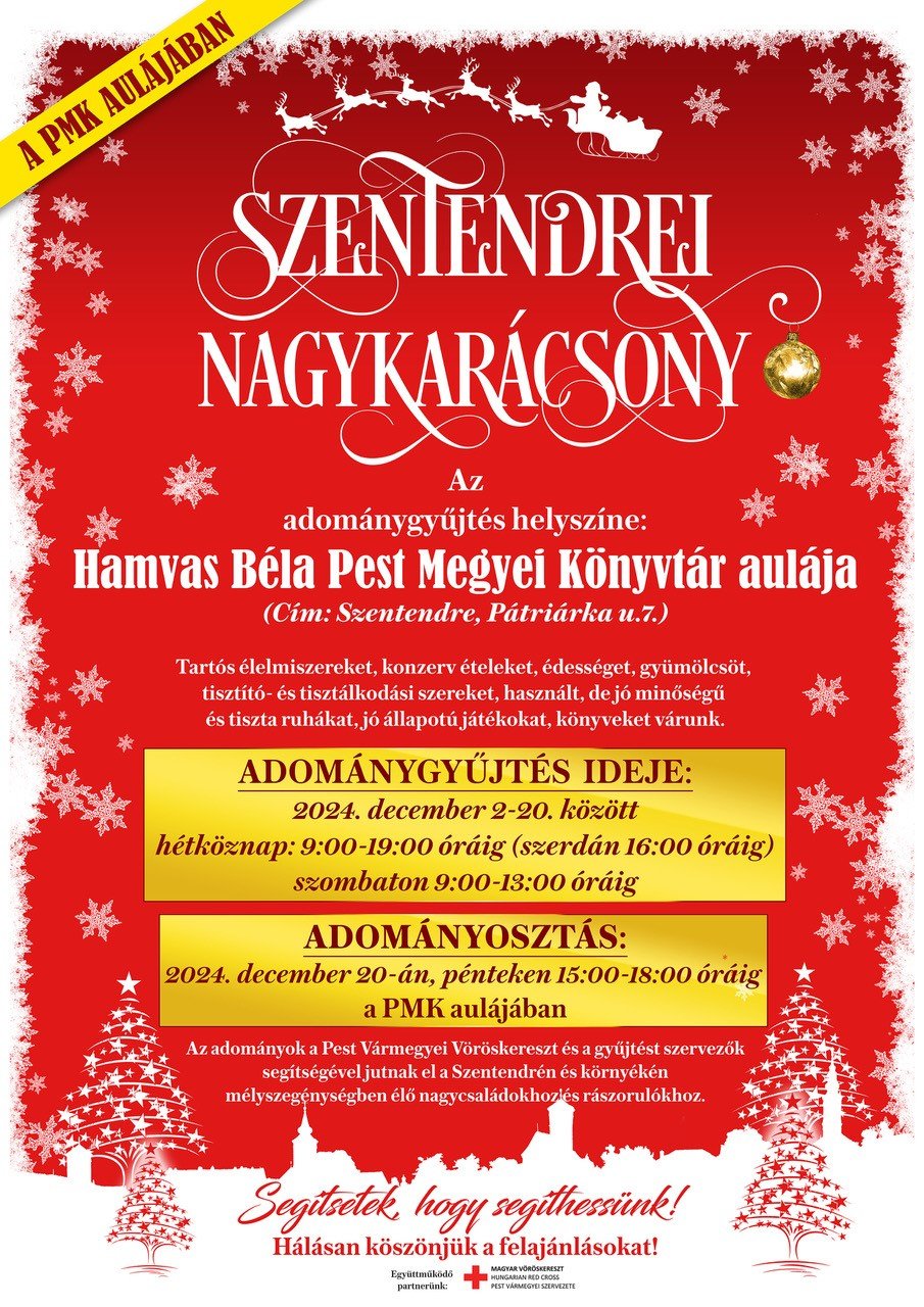 Idén immáron 11. alkalommal indul újra a Szentendrei Nagykarácsony adománygyűjtő akció, melynek célja, hogy segítse a Szentendrén és környékén élő mélyszegénységben lévő családokat és egyedülálló időseket. Az adománygyűjtés az elmúlt évtized során hagyományá vált, és minden évben egyre több emberhez juttatja el a segítséget. Az akció ezen a héten is zajlik, és minden támogatás számít!