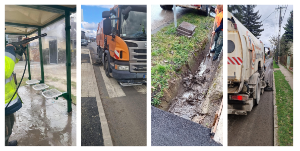 A téli síkosságmentesítés után kiemelten fontos a burkolatok megtisztítása a visszamaradt szóróanyagoktól. A szakemberek gépi és kézi erővel végzik a padkák és járdák seprését, eltávolítják a felgyülemlett hordalékot és gyomokat, továbbá megtisztítják a hidakat és a víznyelő rácsokat a zavartalan vízelvezetés érdekében.