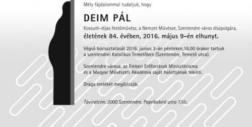 Tisztelt Lakosság! Tájékoztatjuk Önöket, hogy Deim Pál Kossuth-díjas festőművész temetése 2016. június 3-án 16.00 órai kezdettel lesz a Szentendrei Katolikus Temetőben. A nyilvános szertartás a Barcsay Jenő téren lesz. Emiatt a temető környékén a gépjárműforgalmat érintő lezárások lesznek 2016. június 3-án 14.00 órától 18.00 óráig.